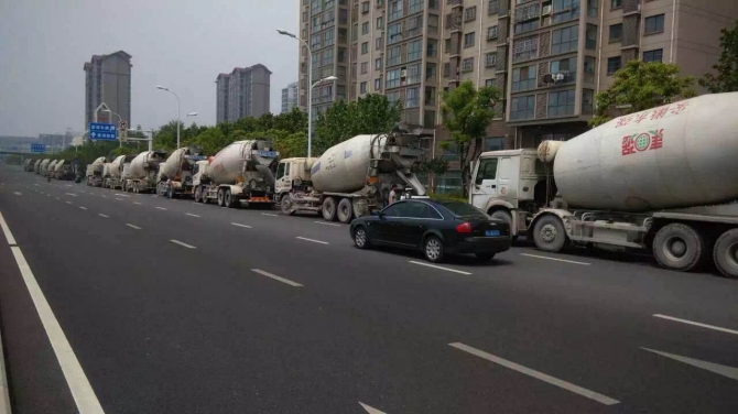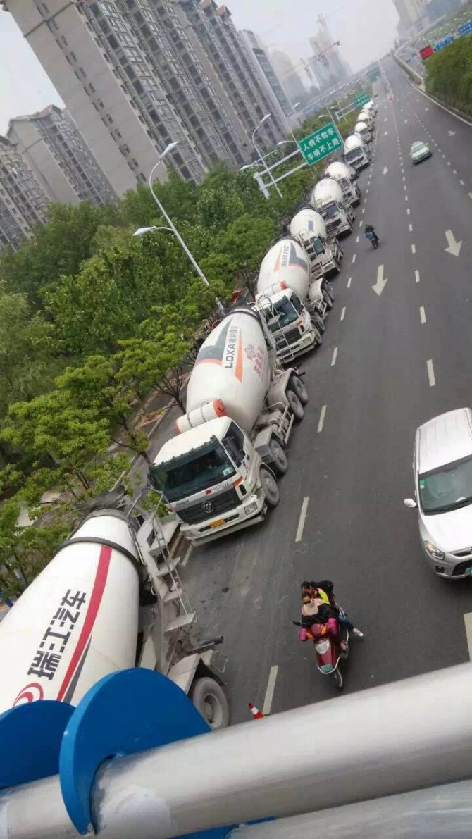 下圖為澆筑該項(xiàng)目主樓12000m3大體積同時(shí)現(xiàn)場等待的砼攪拌車。