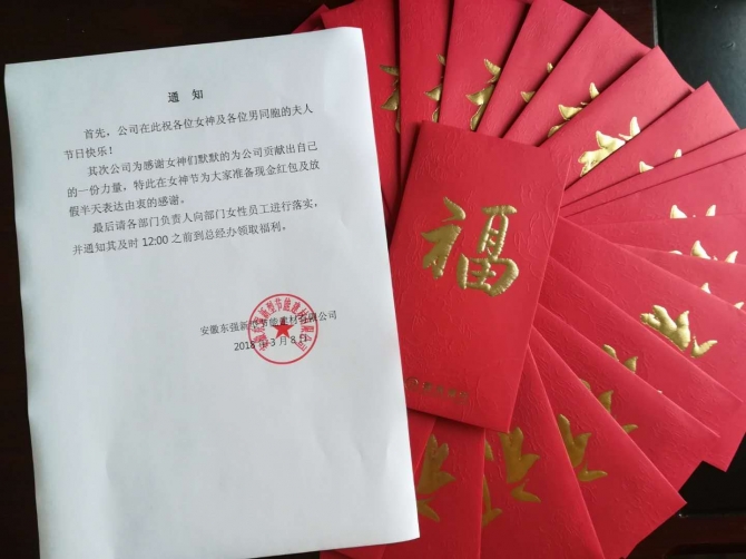 公司為感謝女神們默默的為公司貢獻出自己的一份力量,特此在女神節(jié)為大家準備現(xiàn)金紅包及放假半天表達由衷的感謝。