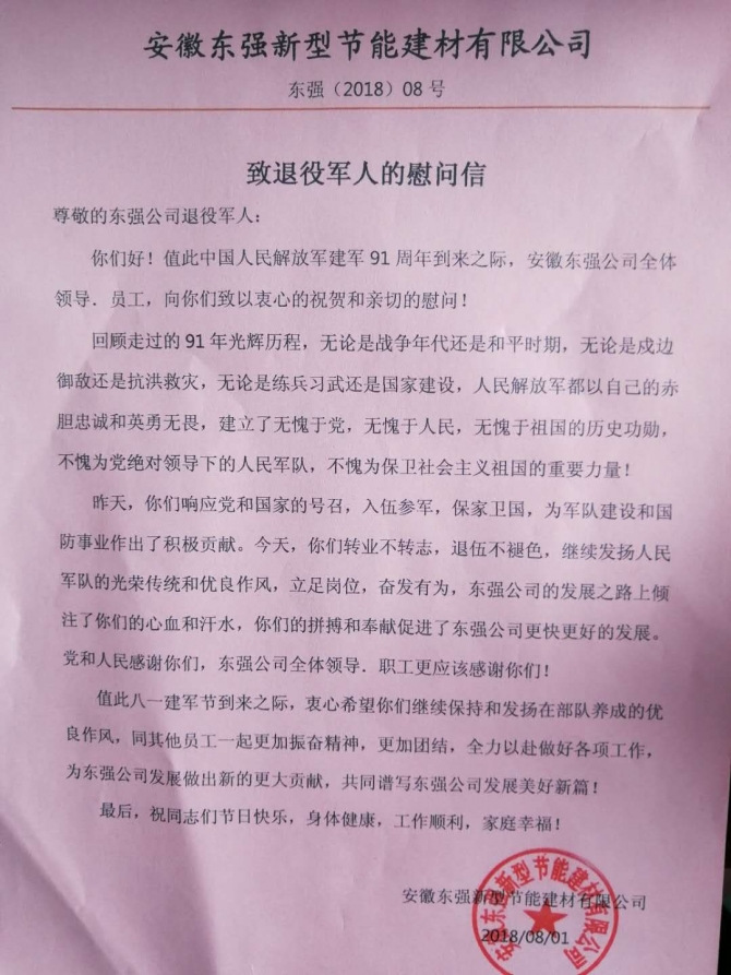 今天迎來(lái)中國(guó)人民解放軍建軍91周年,安徽東強(qiáng)公司全體領(lǐng)導(dǎo)、員工,向祖國(guó)最親愛的子弟兵致以衷心的祝福,同時(shí)向公司退伍軍人表達(dá)親切的慰問(wèn)。