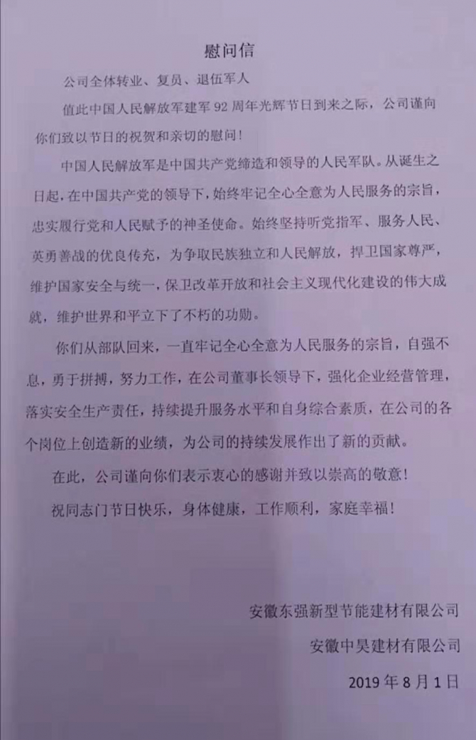 2019年8月1日迎來中國(guó)人民解放軍建軍92周年,公司全體領(lǐng)導(dǎo)、員工,向祖國(guó)最親愛的子弟兵致以衷心的祝福,同時(shí)向公司退伍軍人表達(dá)親切的慰問。